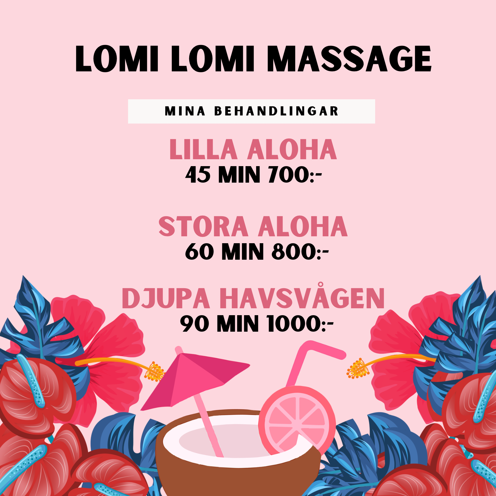 Välkommen till mig på massagebehandlingar i hawaiiansk Lomi Lomi Massage! Se alla tider i bokningssystemet! Jag har tider måndagar, onsdagar, lördagar och söndagar. I februari har jag även kvällstider på torsdagar. Skulle du inte hitta nån tid som passar kan du alltid sms:a, maila eller ringa så ser vi om vi hittar en tid som passar dig! Här hittar du recensioner från klienter som varit på Lomi Lomi Massage.